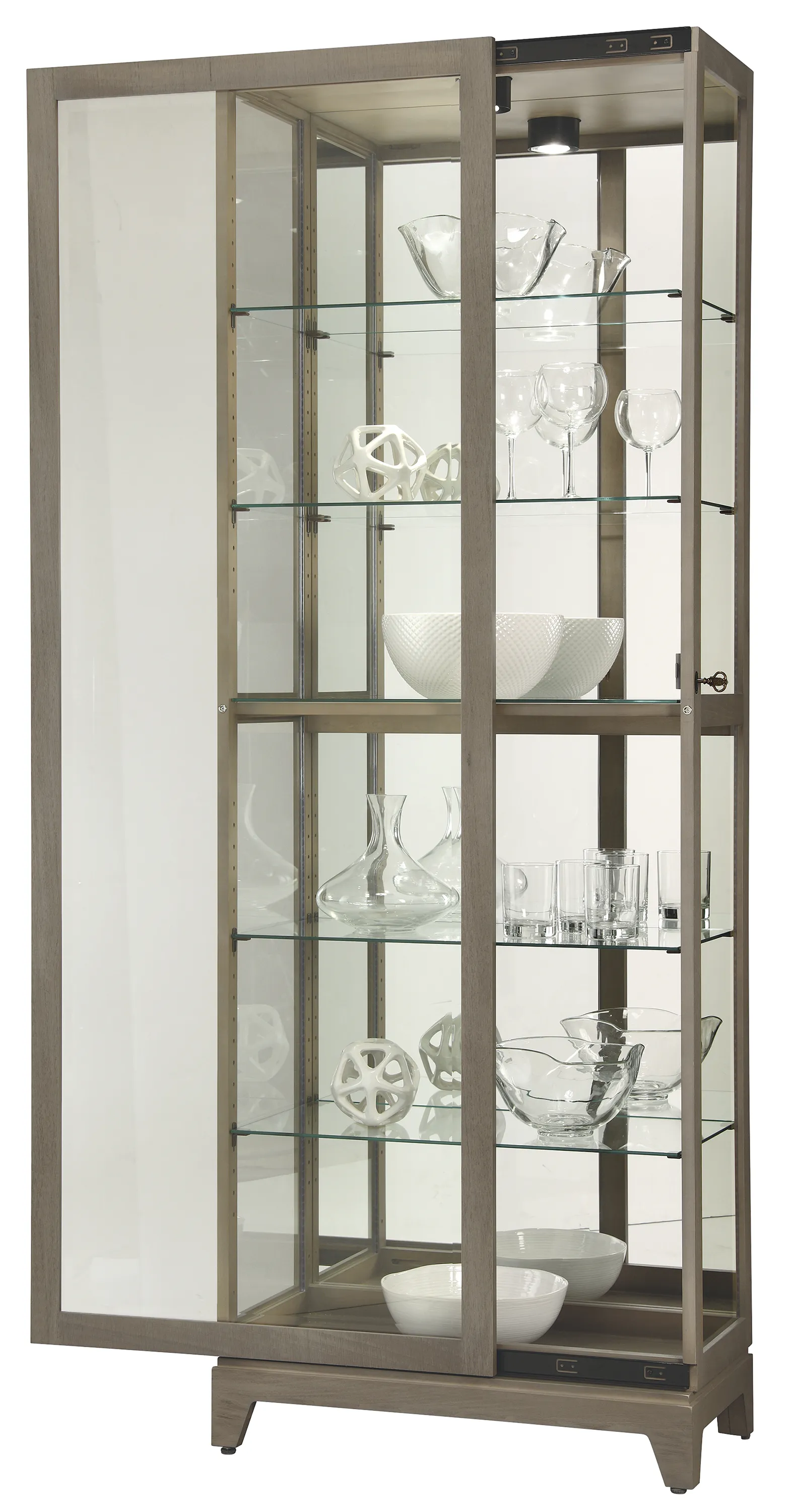 - Showcase your decorative objects with the Luke VI curio cabinet. This distinctive piece provides six levels of display and has an Aged Grey finish to complement any décor. Select Hardwood Construction: This curio cabinet is made from select hardwoods and veneers for durability and style. It has a wire-brushed Aged Grey finish that mimics the weathered appearance of reclaimed wood, along with a glass mirrored back for contemporary flair. Locking Glass Door: The two-way beveled glass door on this curio cabinet slides open for easy access and locks for security. A holder on the back of the case provides handy storage for the key. Plenty of Display Space: There are five adjustable glass shelves and six levels inside this glass display cabinet to accommodate your collectibles. The shelves are kept secure with Pad-Lock™ cushioned metal shelf clips. Interior Lighting: Illuminate your treasures with the lighting inside this curio cabinet. It’s easy to turn on and off with the No-Reach™ roller light switch on the back of the cabinet. Stability on Any Floor: This lighted curio cabinet is equipped with adjustable levelers under each corner, so you can place it on carpets or uneven floors. Howard Miller: Founded in 1926 and still family-owned in its third generation, Howard Miller is the world’s leading clock company and a respected brand name in fine specialty furnishings such as curio cabinets, wine & bar furnishings, custom storage cabinets, and SmartMoves® adjustable height desks.