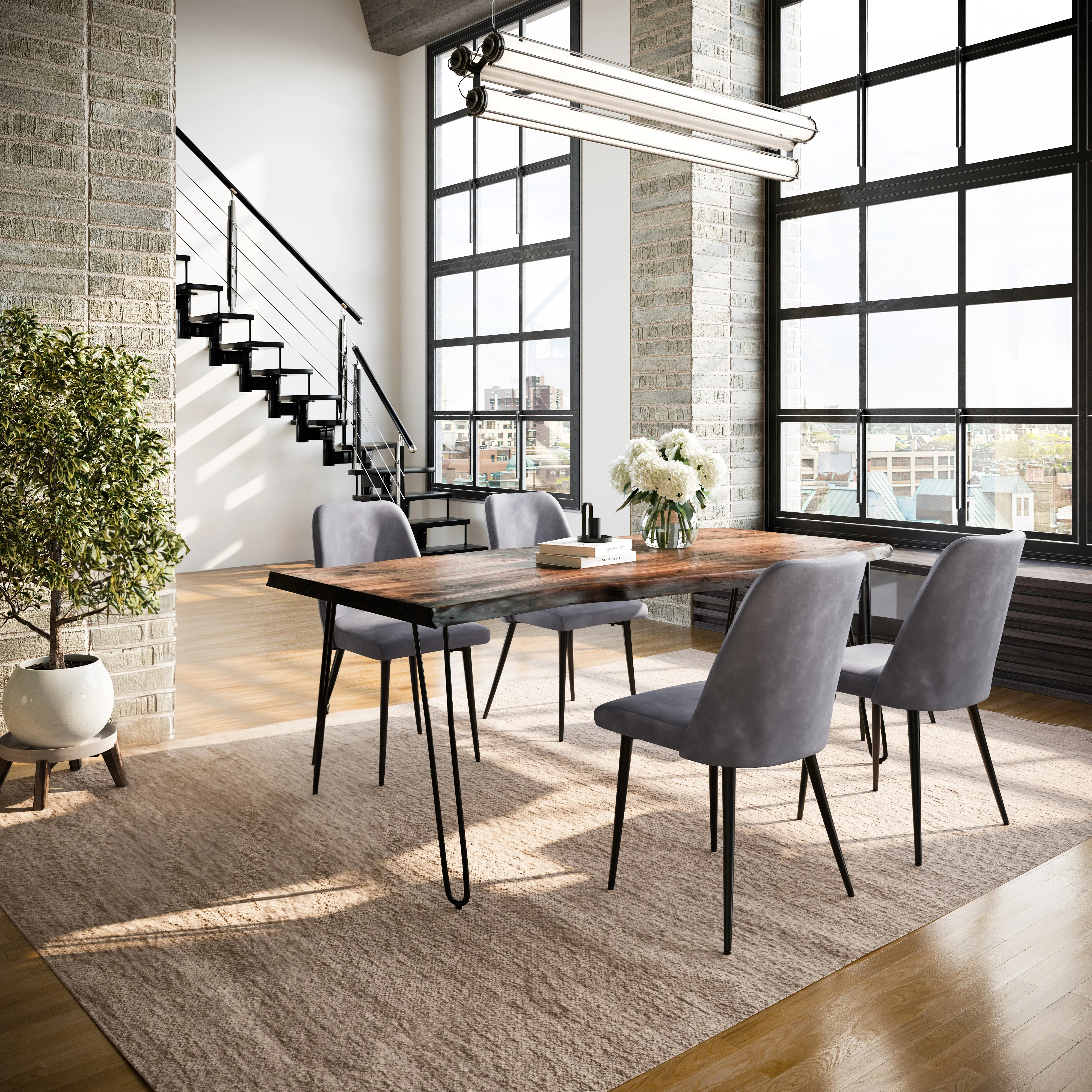 • -Set Includes 79 Inch Solid Wood Dining Table and Four Upholstered Chairs -Solid Acacia Hardwood with Natural Live Edge -Modern Hairpin Legs -Mid-Century Modern Faux Leather Upholstery -Unique Variations in Live Edge to be Expected - -