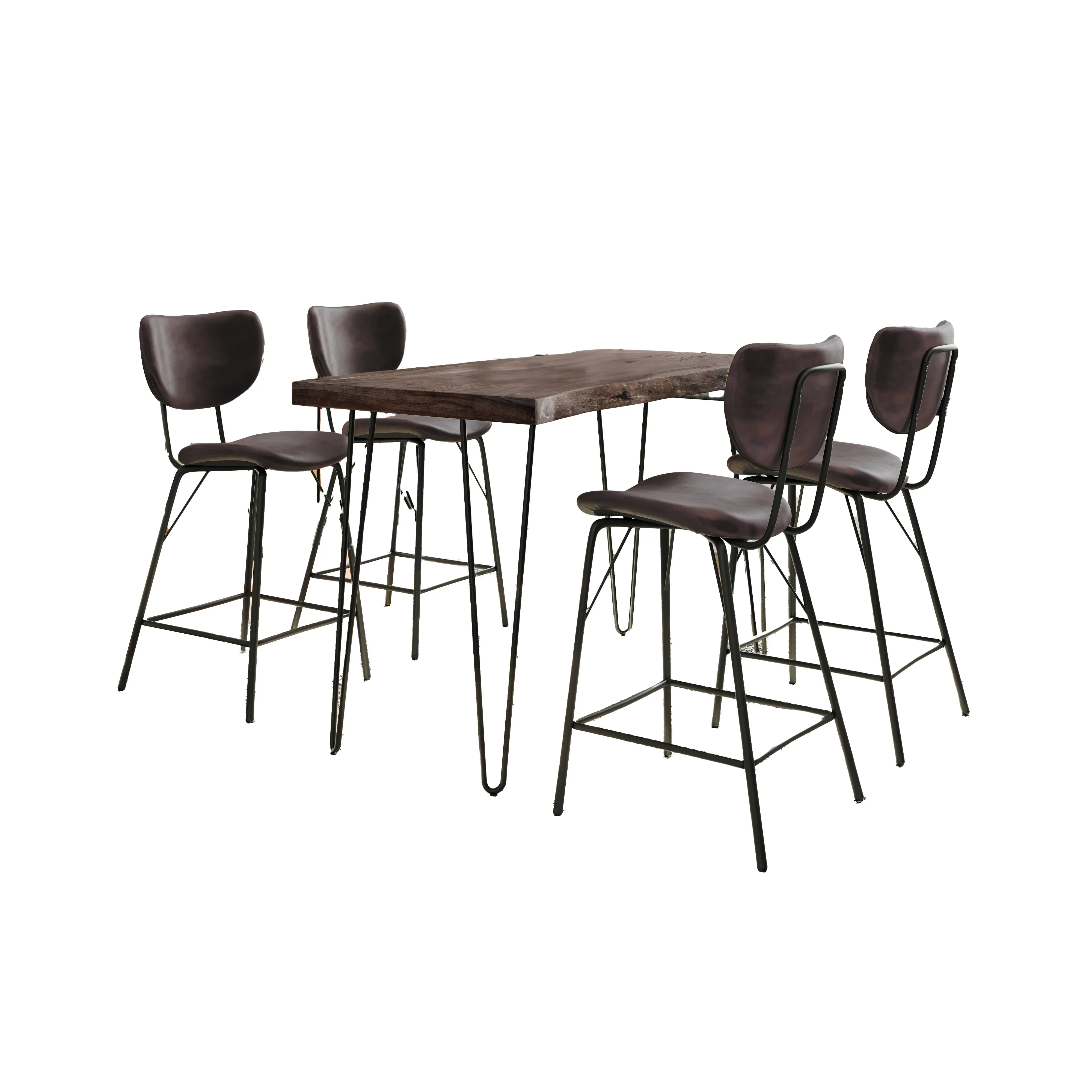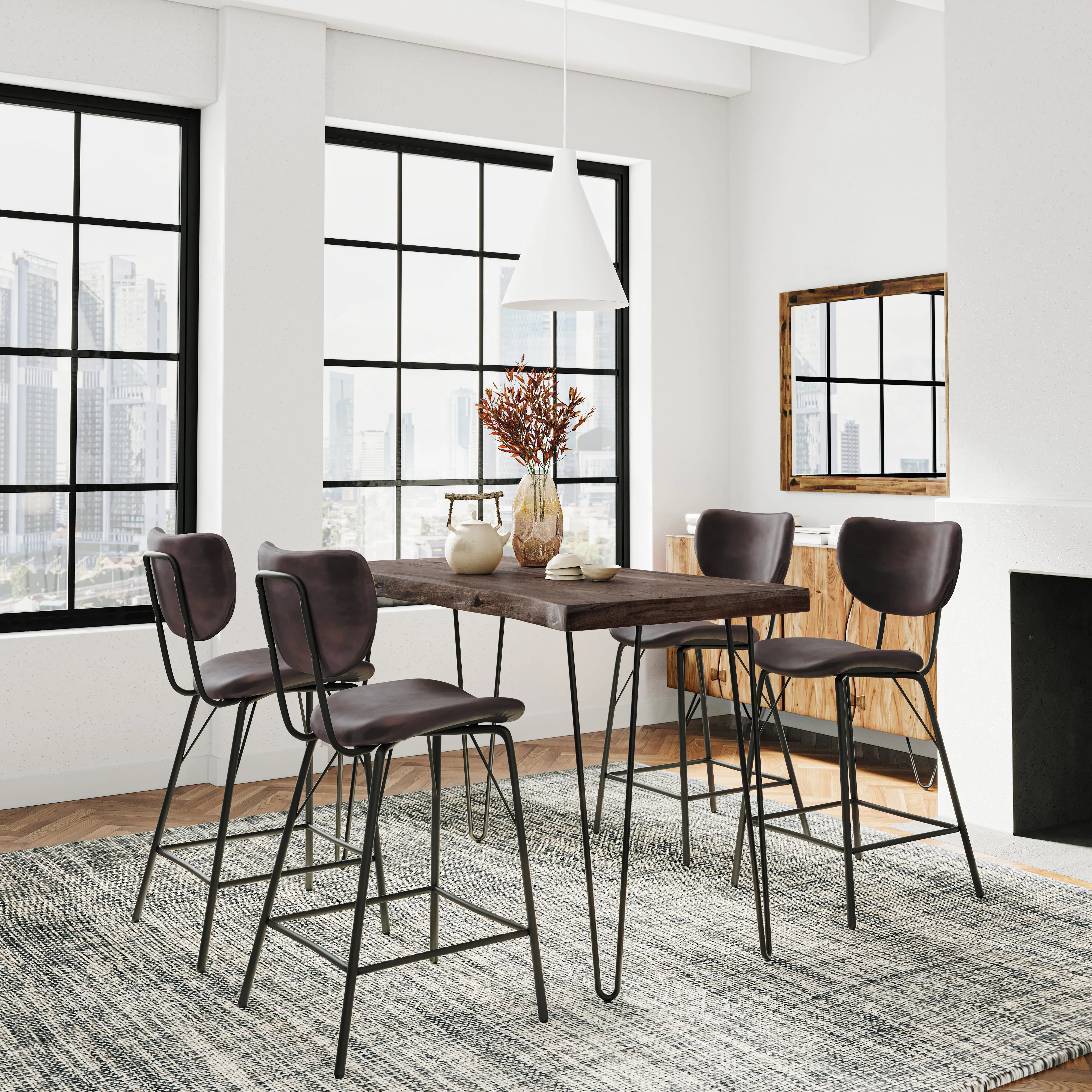 • -Set includes 52 Inch Solid Wood Counter Height Dining Table and Four Modern Upholstered Barstools -Solid Acacia Hardwood with Natural Live Edge -Modern Faux Leather Upholstery -Iron Hairpin Legs -Unique Variations in Live Edge To Be Expected - -