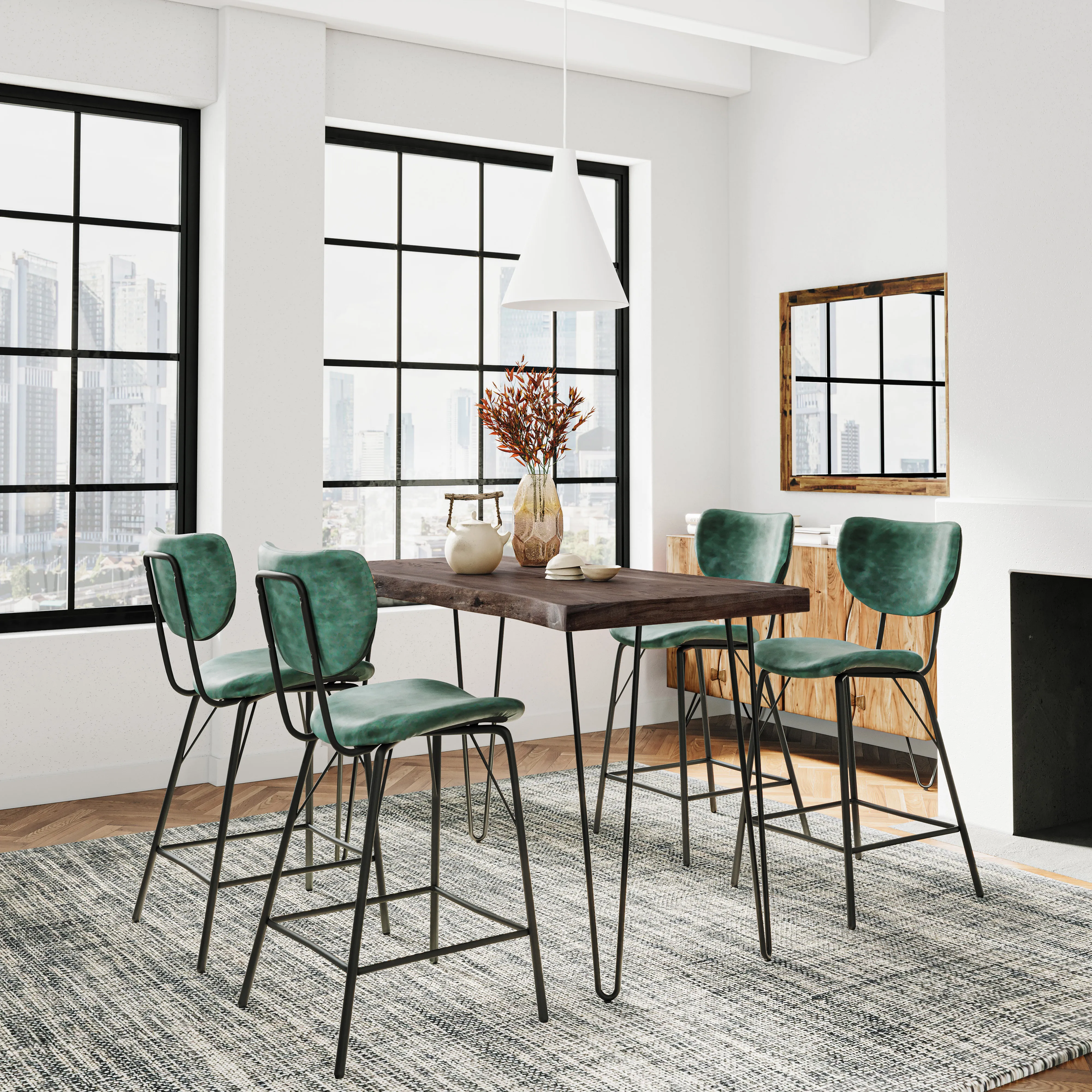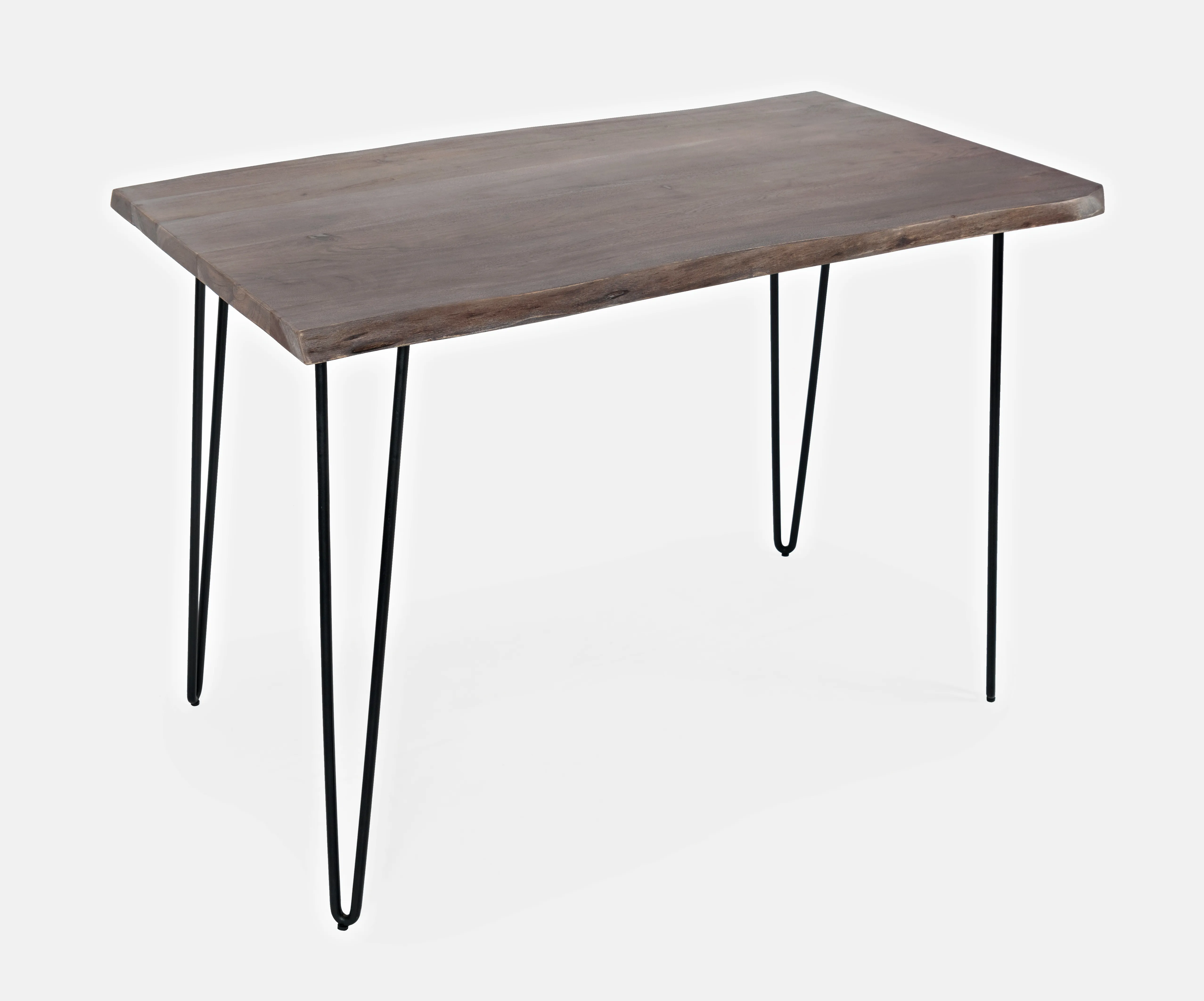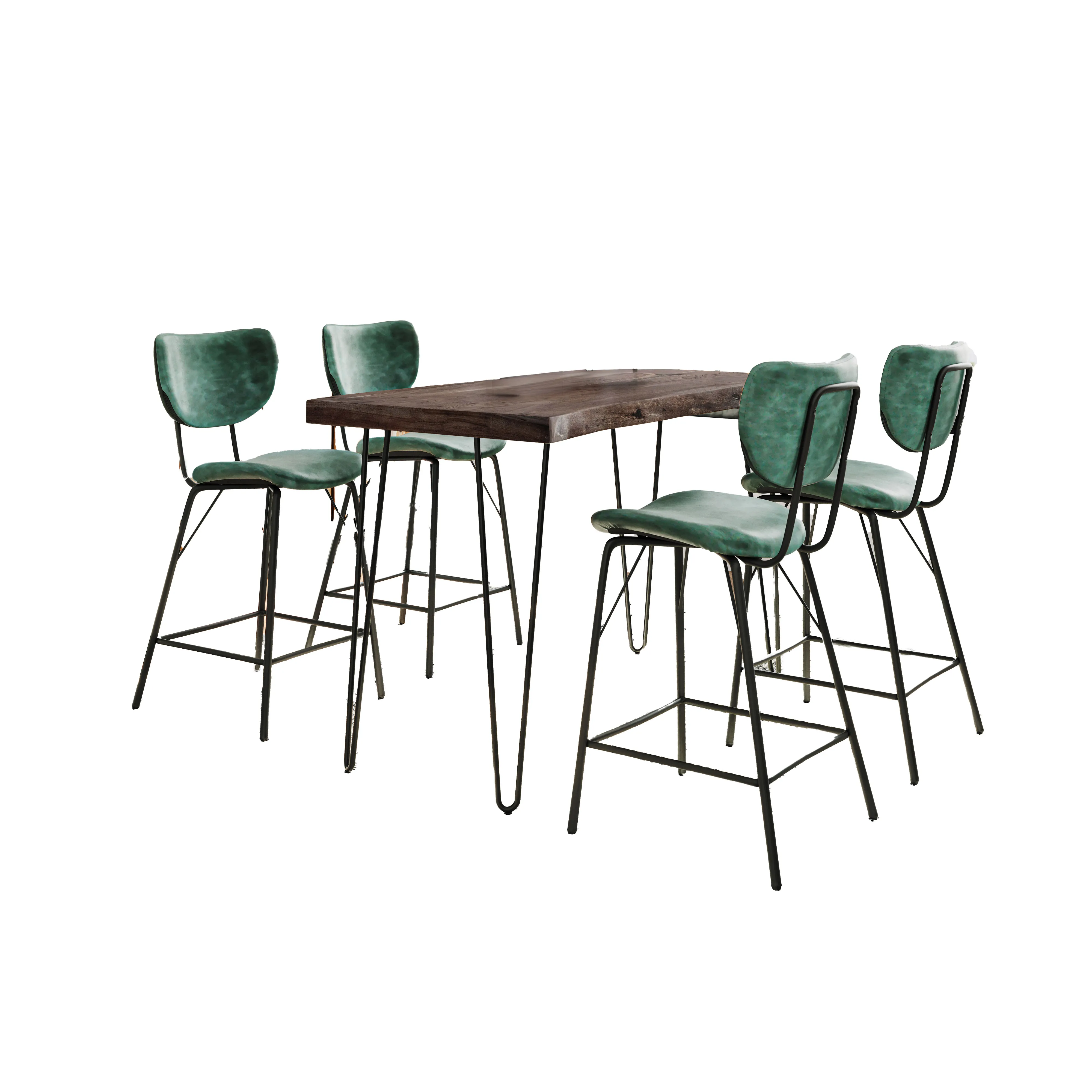 • -Set includes 52 Inch Solid Wood Counter Height Dining Table and Four Modern Upholstered Barstools -Solid Acacia Hardwood with Natural Live Edge -Modern Faux Leather Upholstery -Iron Hairpin Legs -Unique Variations in Live Edge To Be Expected - -