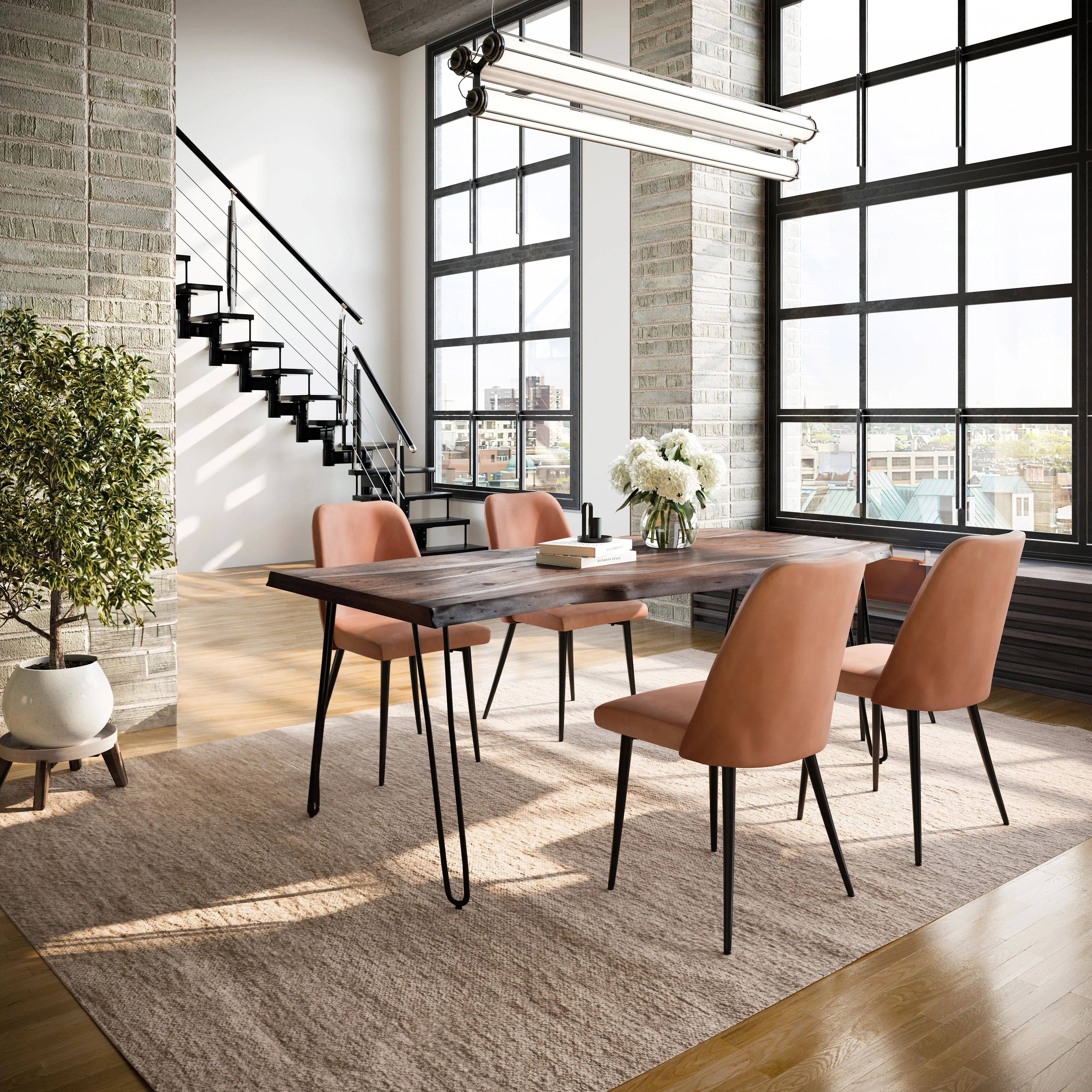 • -Set Includes 79 Inch Solid Wood Dining Table and Four Upholstered Chairs -Solid Acacia Hardwood with Natural Live Edge -Modern Hairpin Legs -Mid-Century Modern Faux Leather Upholstery -Unique Variations in Live Edge to be Expected - -