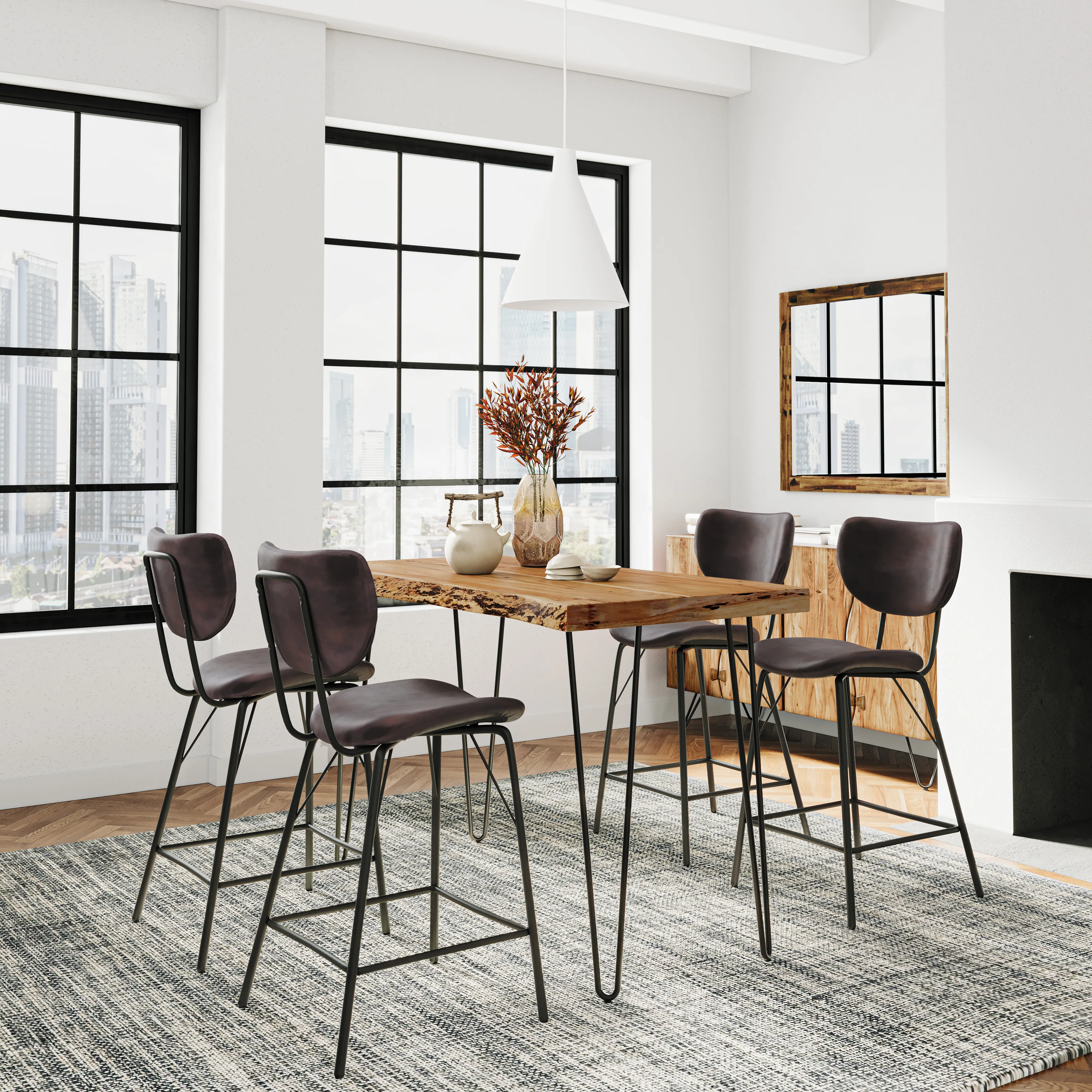 • -Set includes 52 Inch Solid Wood Counter Height Dining Table and Four Modern Upholstered Barstools -Solid Acacia Hardwood with Natural Live Edge -Modern Faux Leather Upholstery -Iron Hairpin Legs -Unique Variations in Live Edge To Be Expected - -