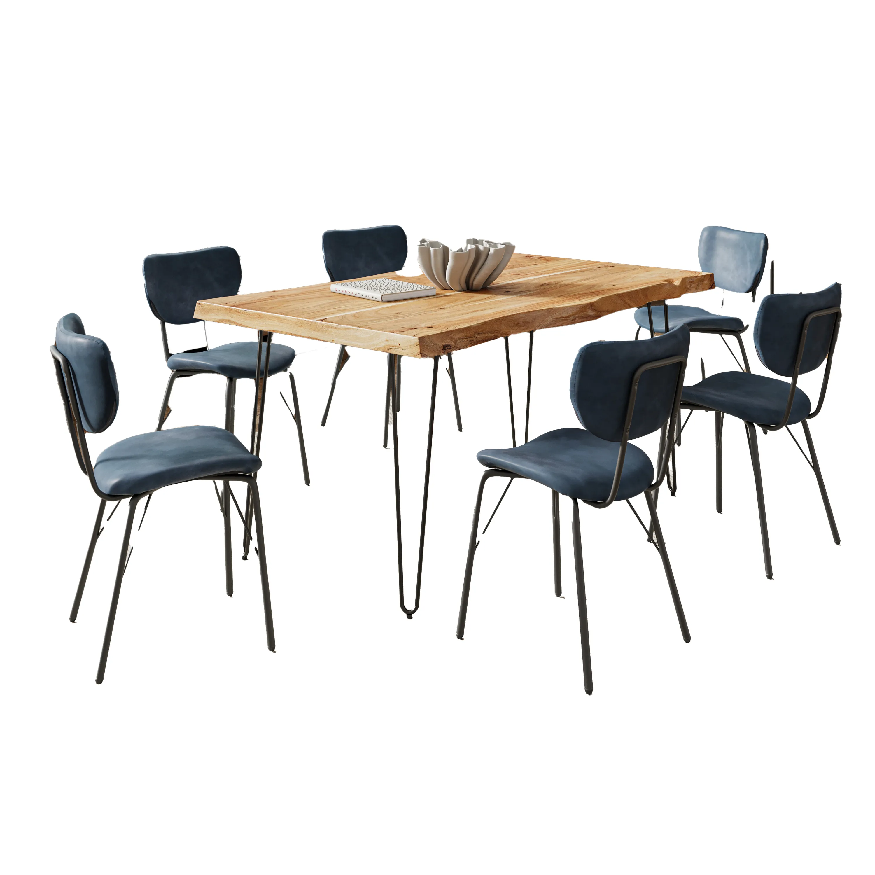• -Set Includes 60 Inch Solid Wood Dining Table and Six Upholstered Chairs -Mid-Century Modern Faux Leather Split-Back Upholstery -Unique Variations in Live Edge to be Expected -Modern Hairpin Legs - - -