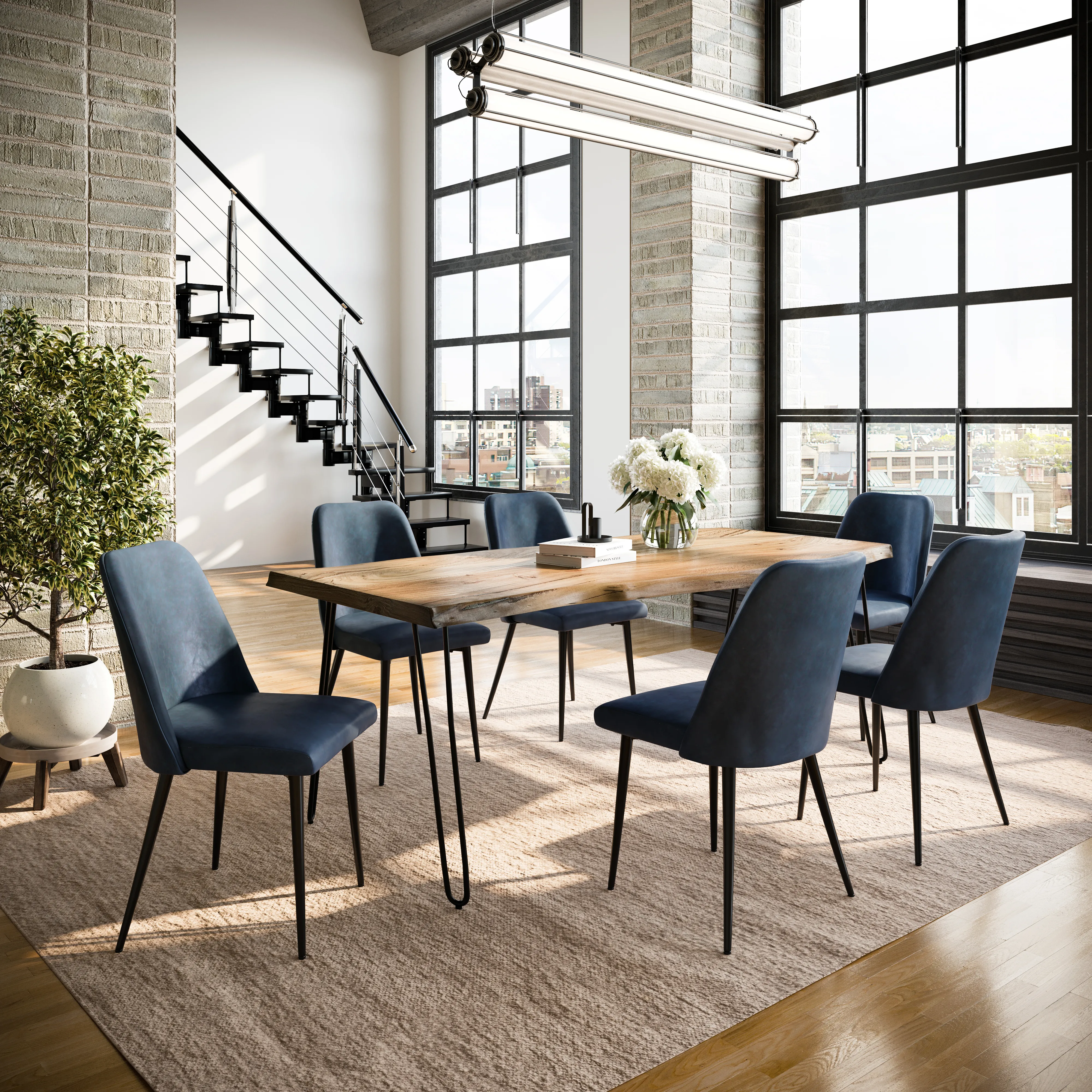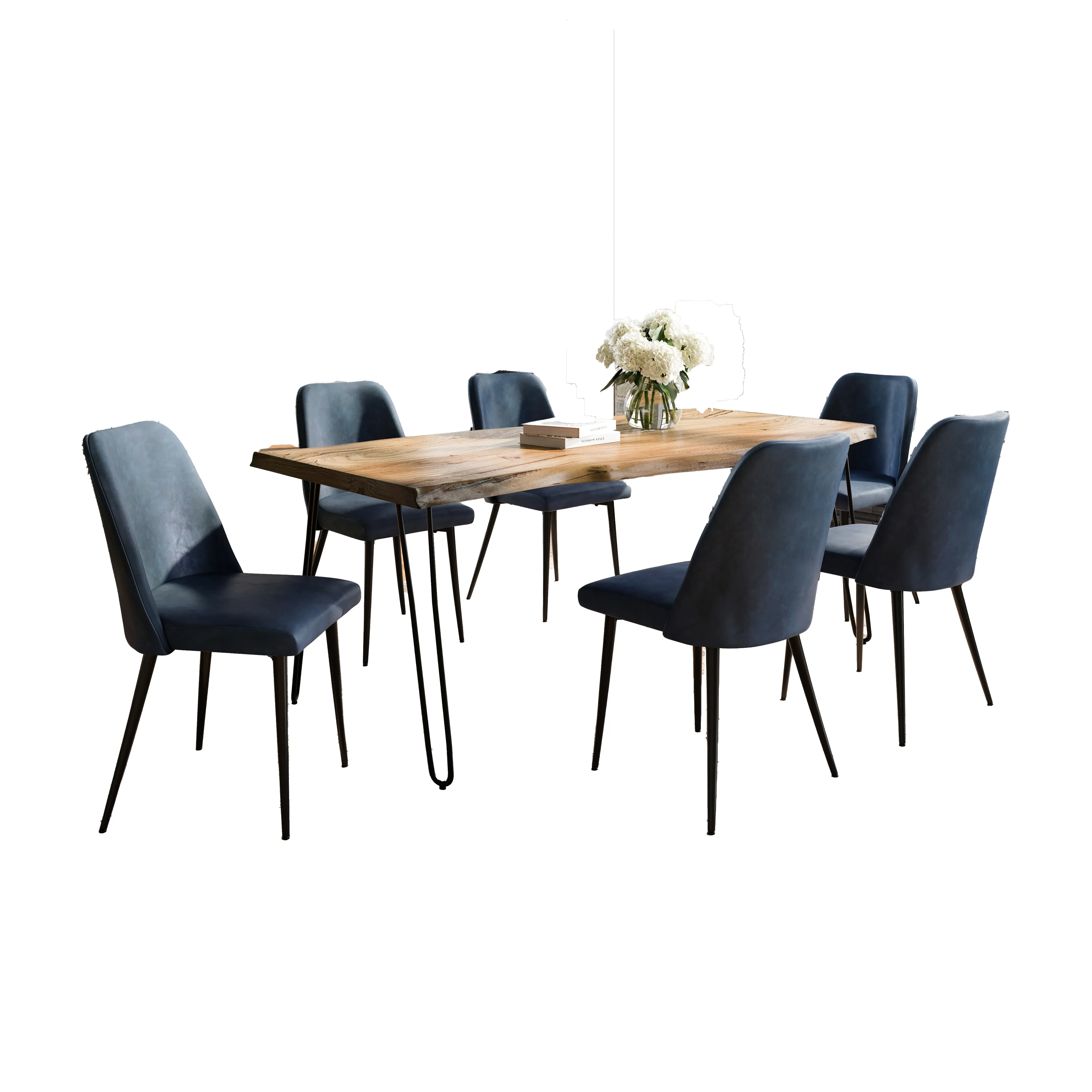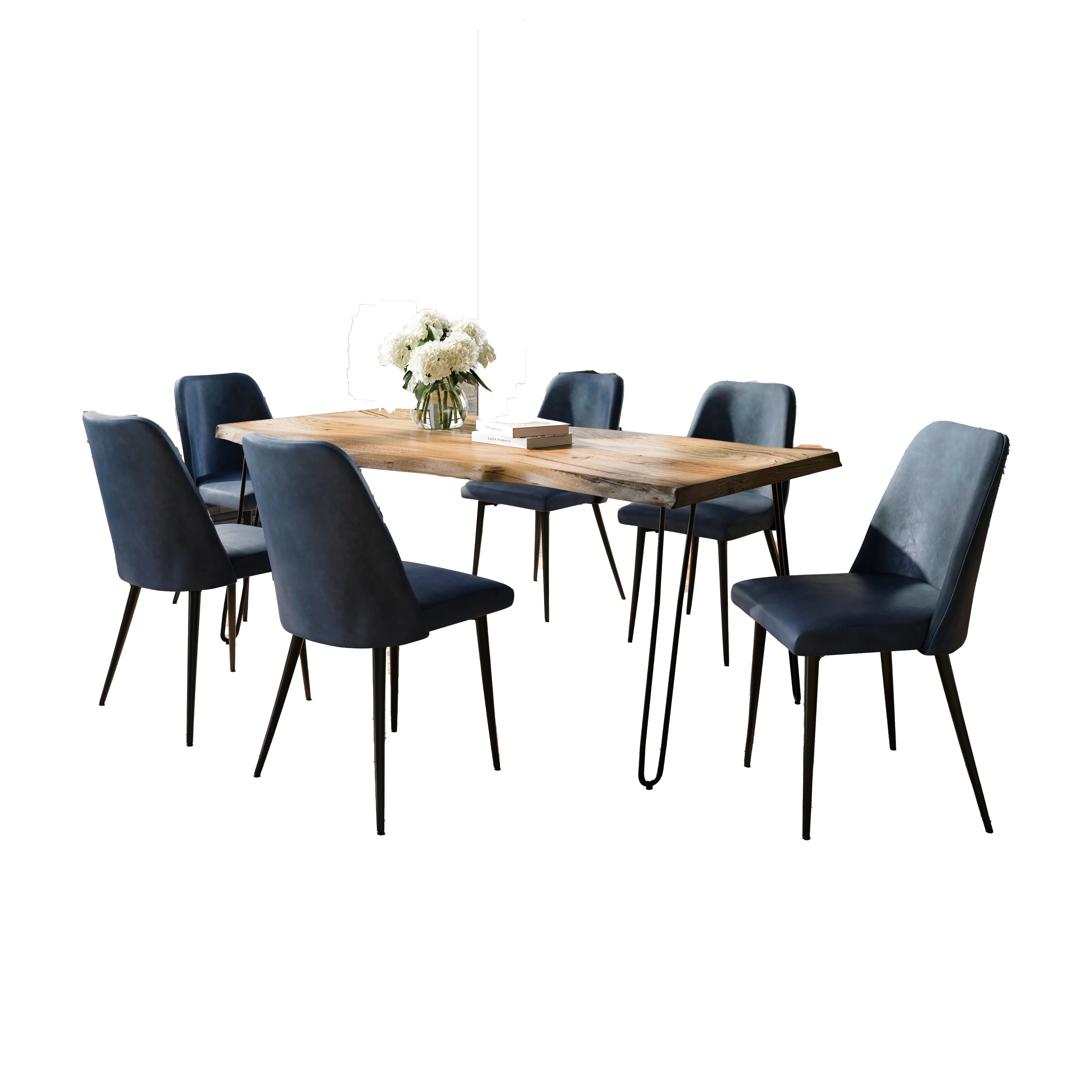 • -Set Includes 79 Inch Solid Wood Dining Table and Six Upholstered Chairs -Solid Acacia Hardwood with Natural Live Edge -Modern Hairpin Legs -Mid-Century Modern Faux Leather Upholstery -Unique Variations in Live Edge to be Expected - -
