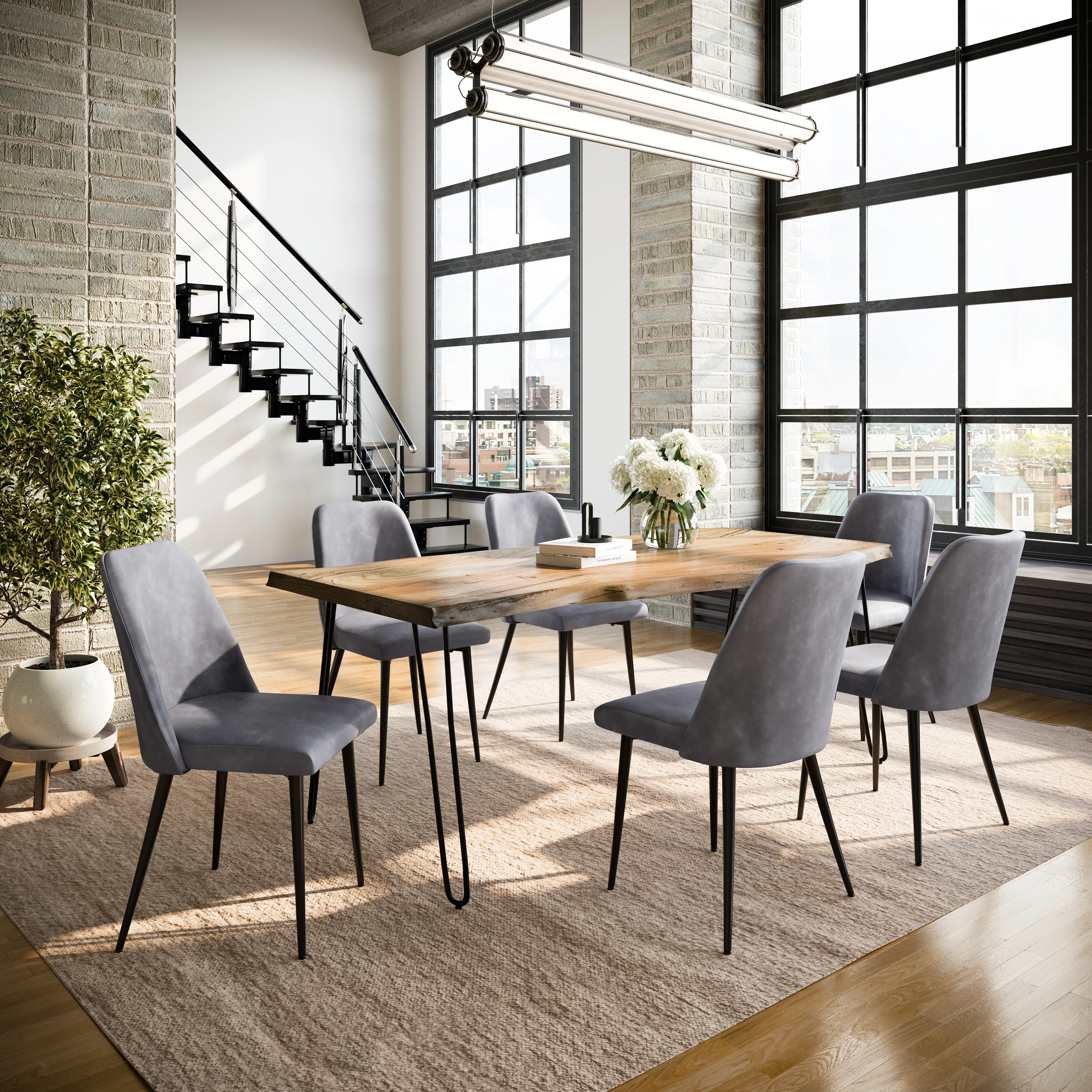 • -Set Includes 79 Inch Solid Wood Dining Table and Six Upholstered Chairs -Solid Acacia Hardwood with Natural Live Edge -Modern Hairpin Legs -Mid-Century Modern Faux Leather Upholstery -Unique Variations in Live Edge to be Expected - -
