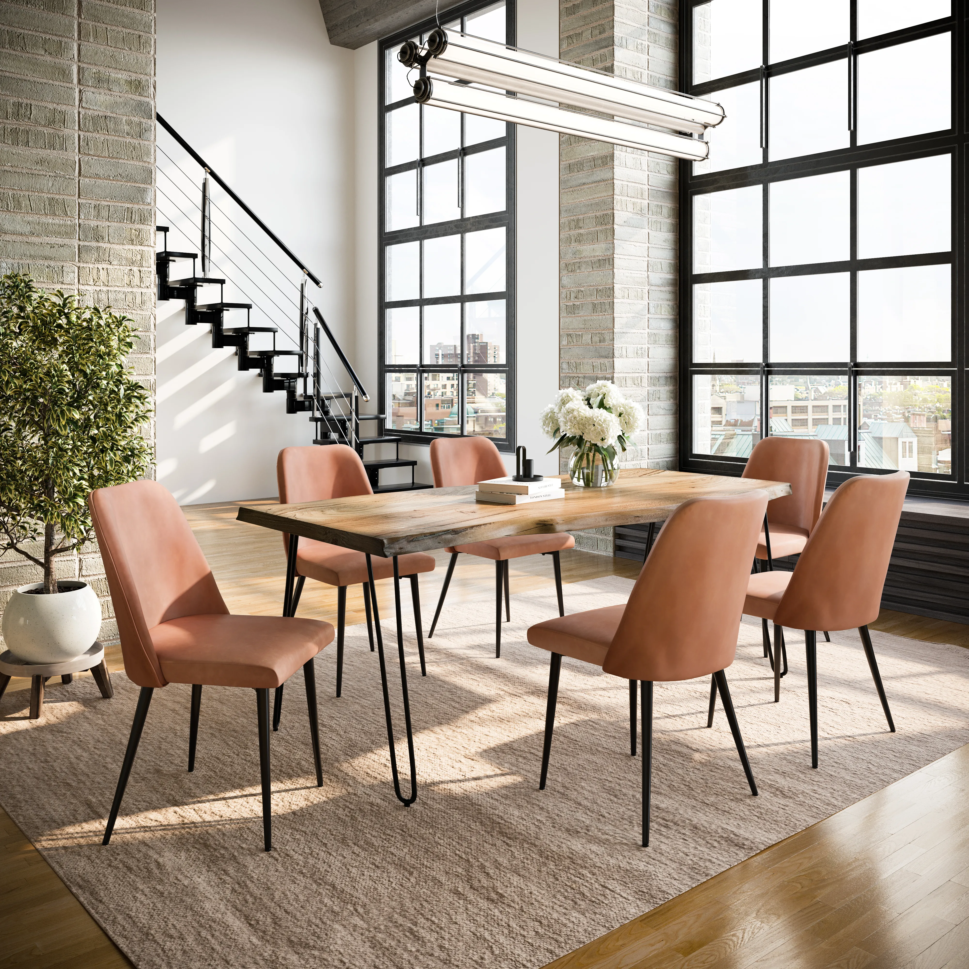 • -Set Includes 79 Inch Solid Wood Dining Table and Six Upholstered Chairs -Solid Acacia Hardwood with Natural Live Edge -Modern Hairpin Legs -Mid-Century Modern Faux Leather Upholstery -Unique Variations in Live Edge to be Expected - -
