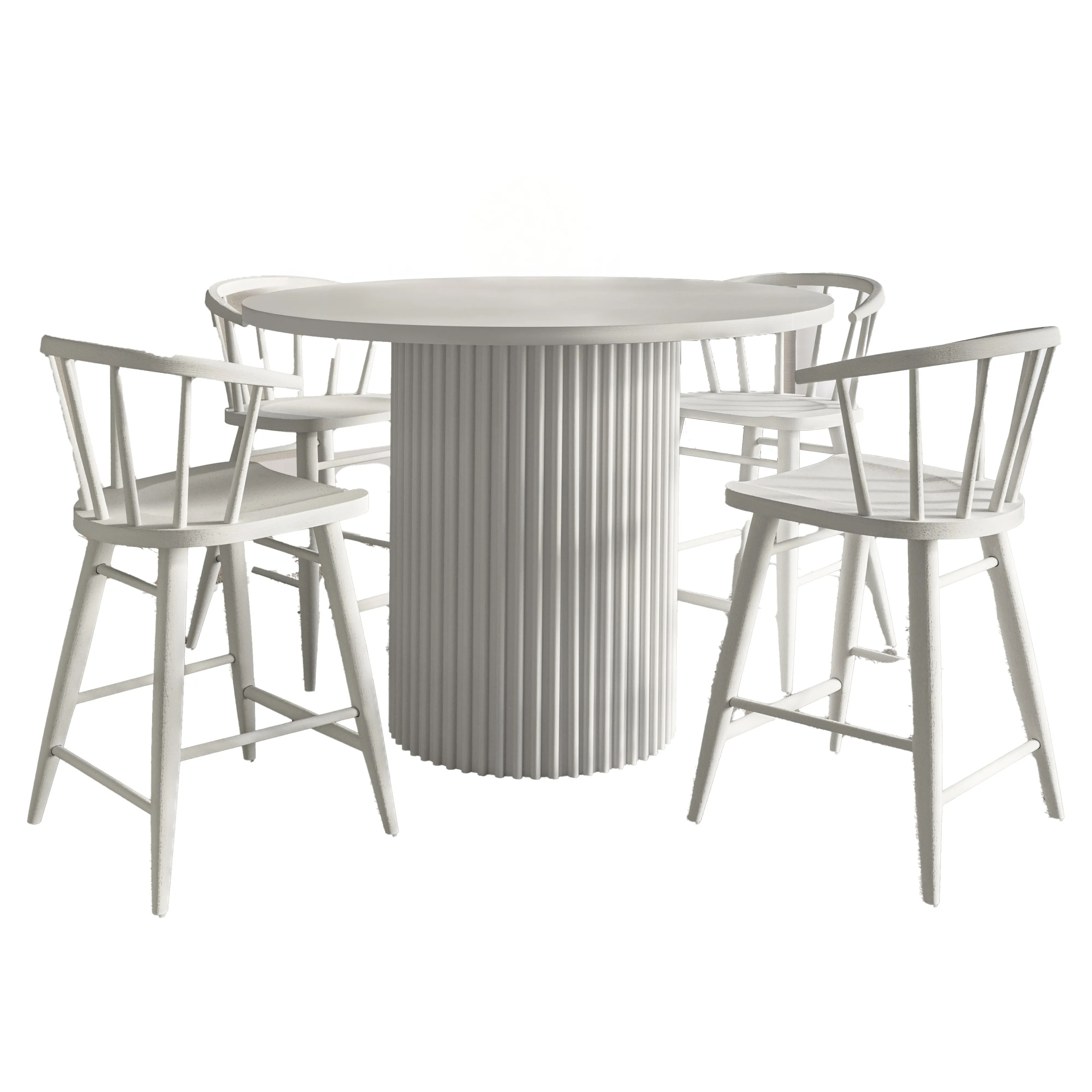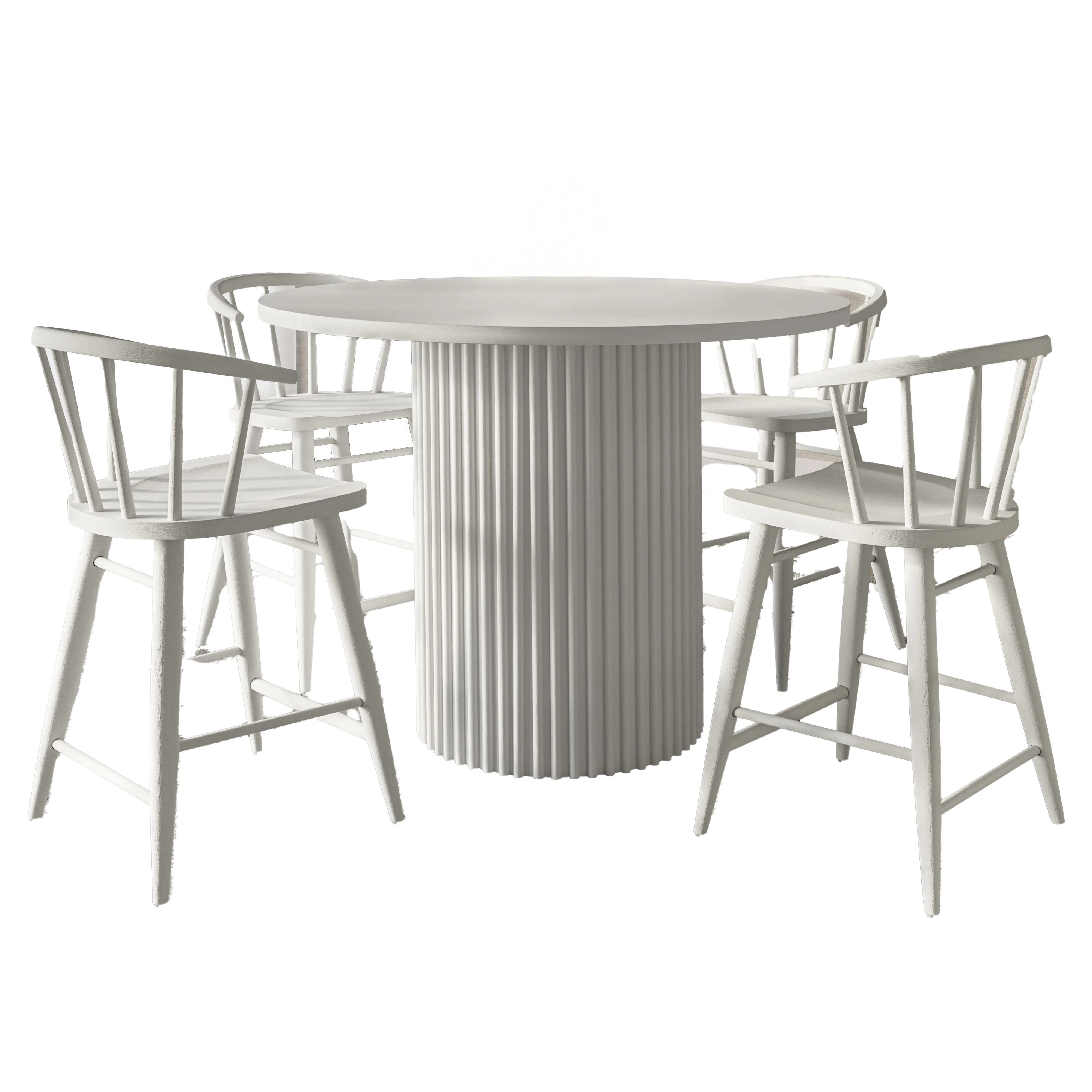 This five-piece counter height dining set offers a refined take on mid-century modern dining. At the center is a sculptural round table with a fluted pedestal base, lending visual interest and architectural detail to any space. Crafted from durable rubberwood and warm wood veneer, the table balances style and strength with ease. Complementing the table are four spindle back barstools, made from solid rubberwood and designed for everyday comfort with gently contoured seats and supportive backs. Ideal for open dining areas, kitchen nooks, or multifunctional living spaces, this set delivers timeless design and lasting craftsmanship. Whether you are hosting friends or enjoying quiet family meals, it brings a sense of thoughtful elegance to every gathering.