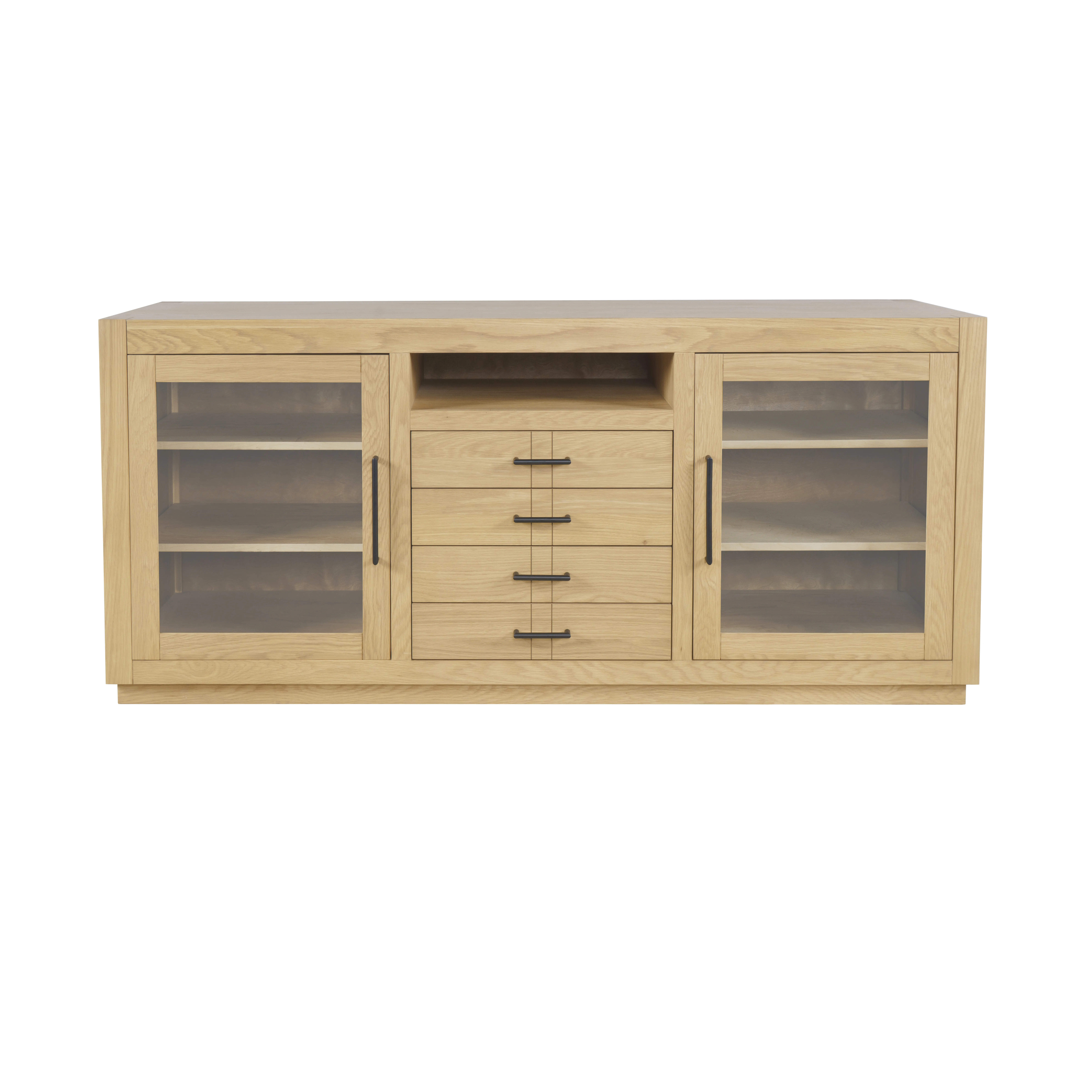 Designed to complement modern and transitional spaces, the Auburn Hills 70" Contemporary Media Console delivers both style and storage. Constructed from high-quality rubberwood, engineered wood, and veneer, this console features a refined wood grain that adds warmth to any setting. The two tempered glass doors with sleek black hardware allow for an elegant display of electronics or curated decor. Four spacious center drawers offer ample storage for media accessories, keeping your space neat and clutter-free. Equipped with four adjustable shelves, this unit provides flexibility to accommodate various entertainment components and display needs. Choose from White, Light Oak, or Dark Oak finishes to match your home's aesthetic. Perfect for living rooms, entertainment areas, or home offices, this media console serves as a focal point while maintaining practicality. Designed for everyday use, the Auburn Hills Contemporary Media Console is a refined addition to any home, balancing timeless appeal with modern utility. Discover how this sophisticated storage solution can bring effortless elegance to your space.