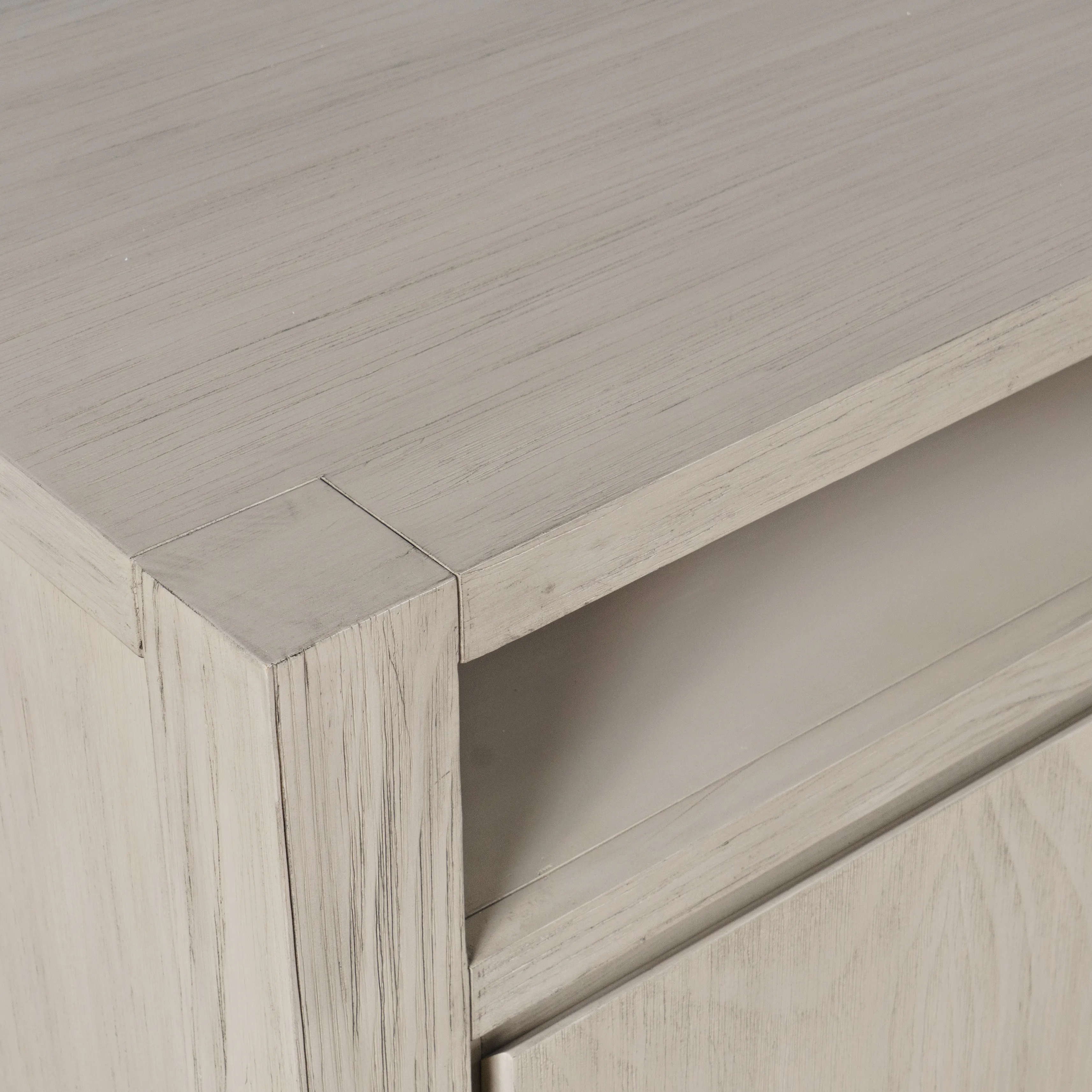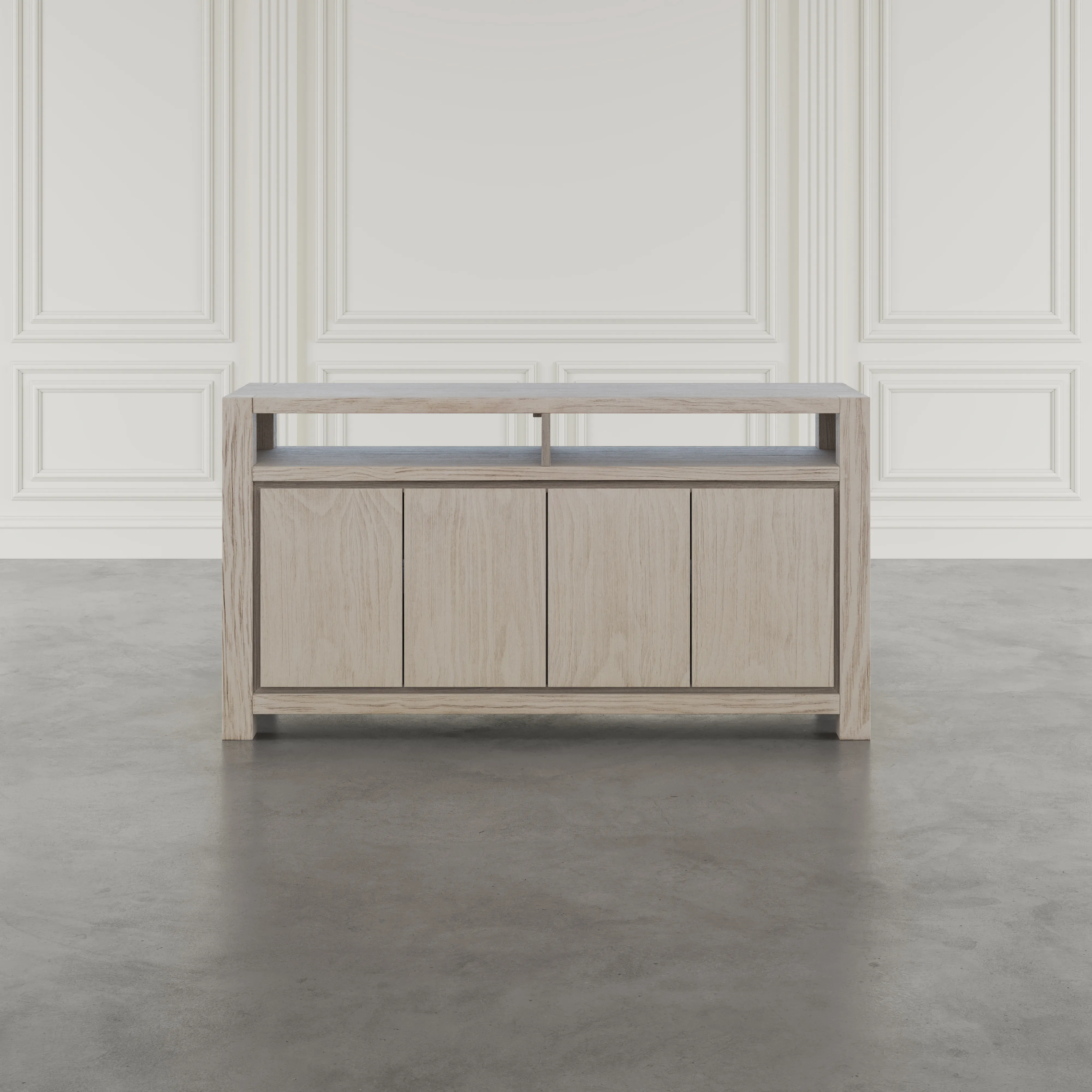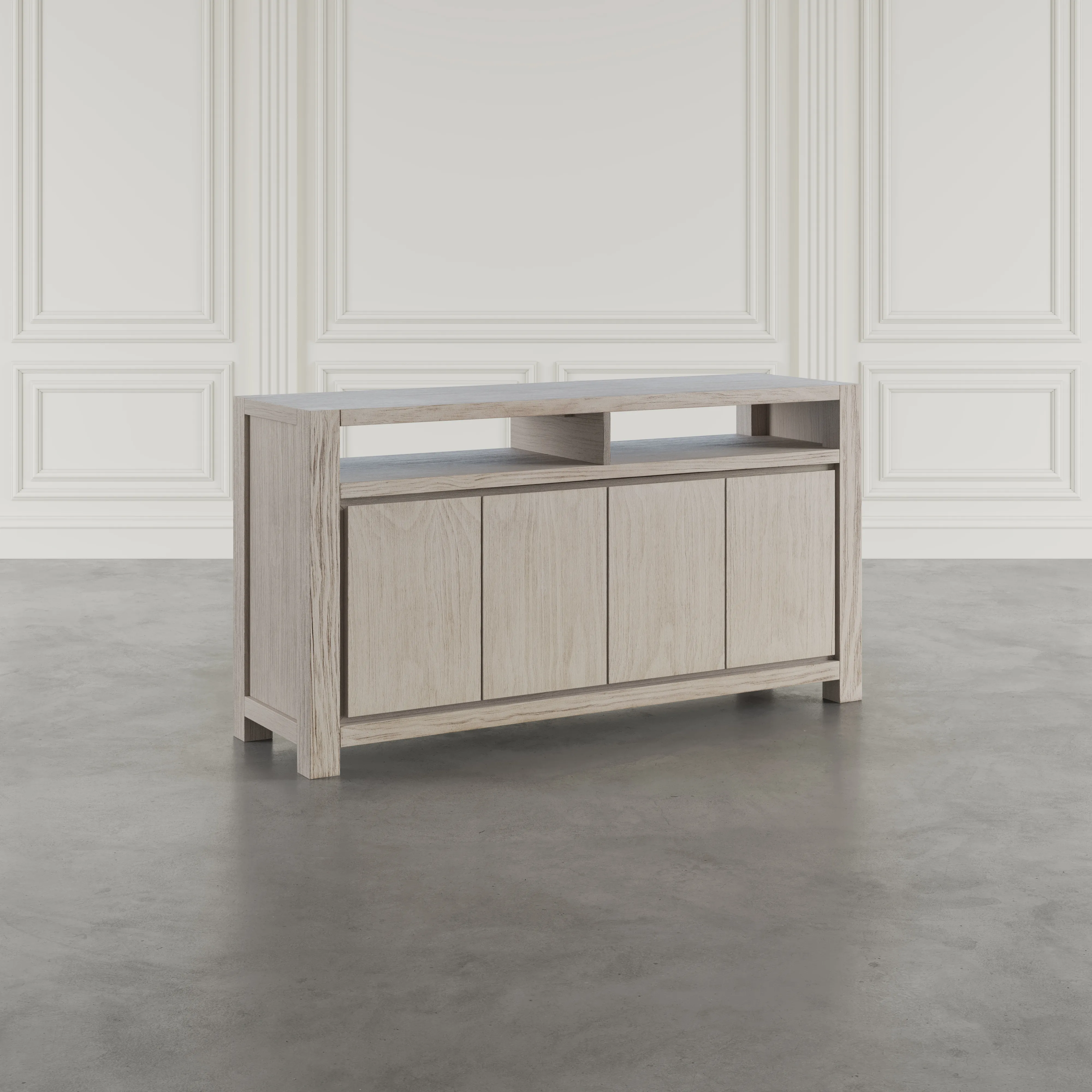 - -Crafted from pine and veneer -Measures 60 inches wide for versatile placement -Four doors open to concealed cabinet storage -Adjustable interior shelves for flexible organization -Cable management cutouts keep wires tidy and hidden -Modern transitional design with framed doors and simple hardware -