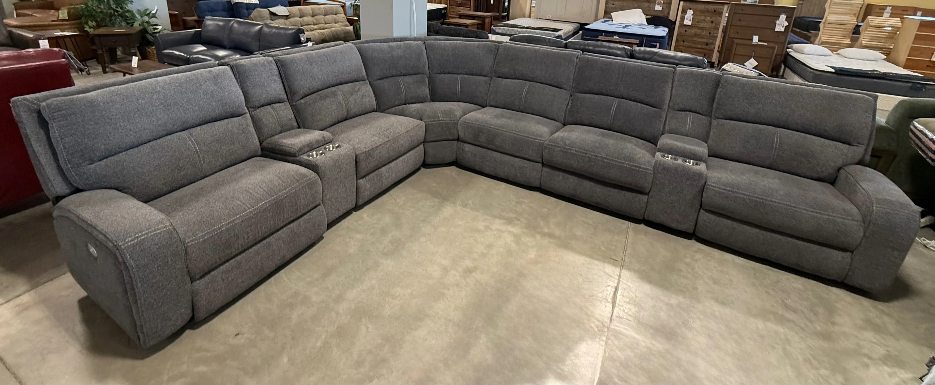 Even commercials are more tolerable when you're relaxing in the plush comfort of this six-piece sectional seating group. You'll love the luxury of its two power recliners on each end that feature power headrests. Between those, you'll find 2 armless recliners, an armless chair, a corner wedge and 2 multifunctional storage consoles with cupholders.