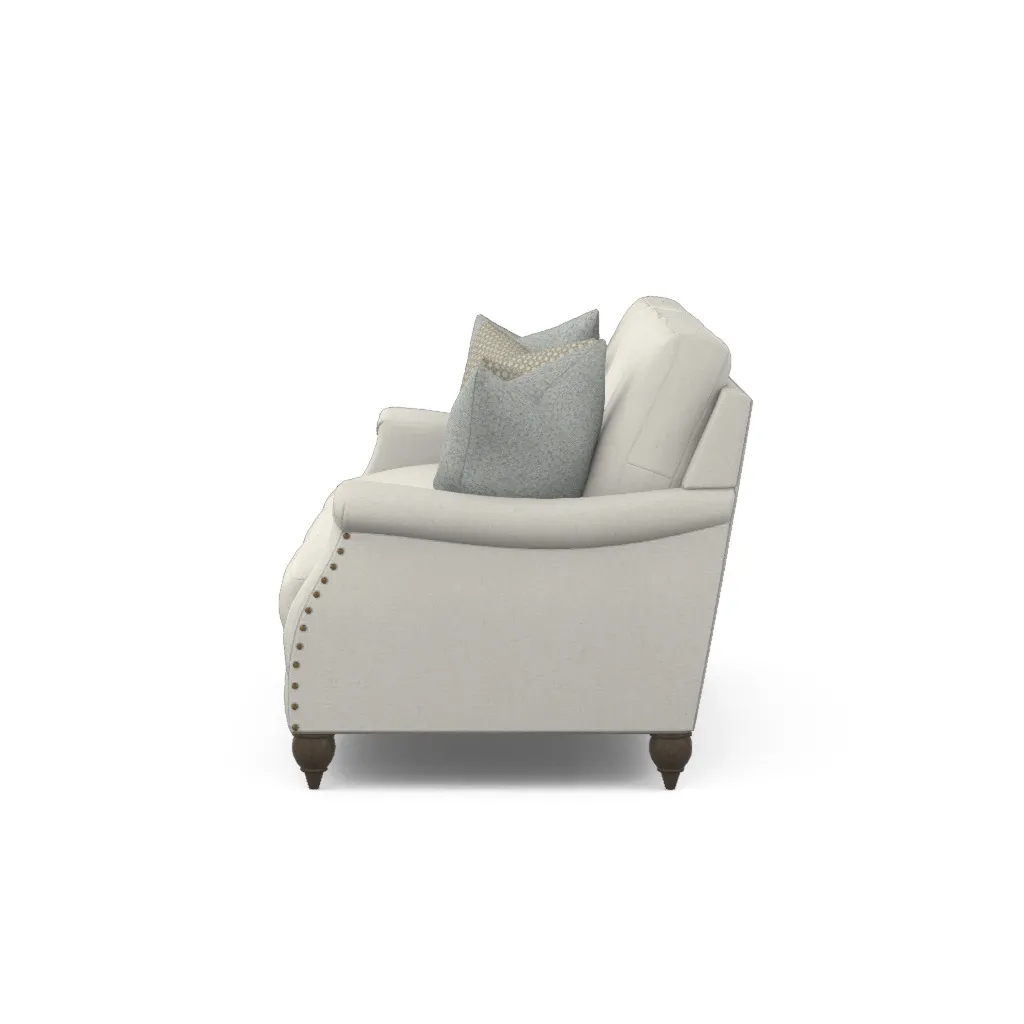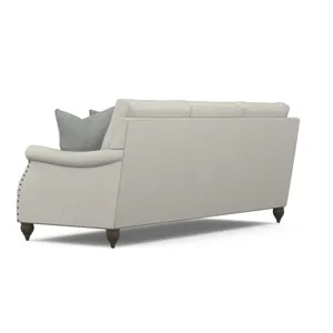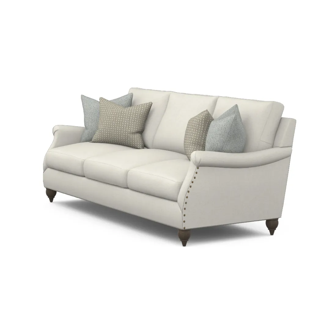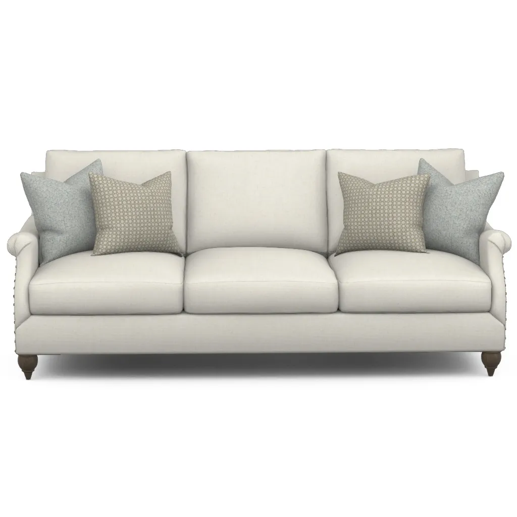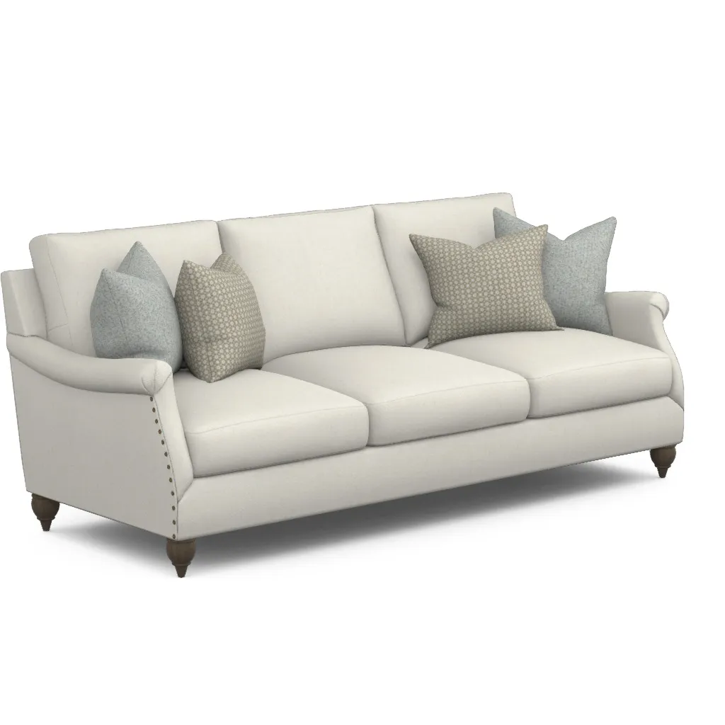 Traditional elegance gets a fresh reinterpretation with the Veda sofa. The petite, pleated roll arms, adorned with a simple nailhead trim, slope down onto stately legs, delivering timeless details and graceful curves that soften the room while adding an abundance of charm. Generous seat space, cushion fill choices, and the Blue Steel Spring at the heart of each seat ensure lasting comfort. And bring your room together with four accent pillows, orderable in your choice of fabric.