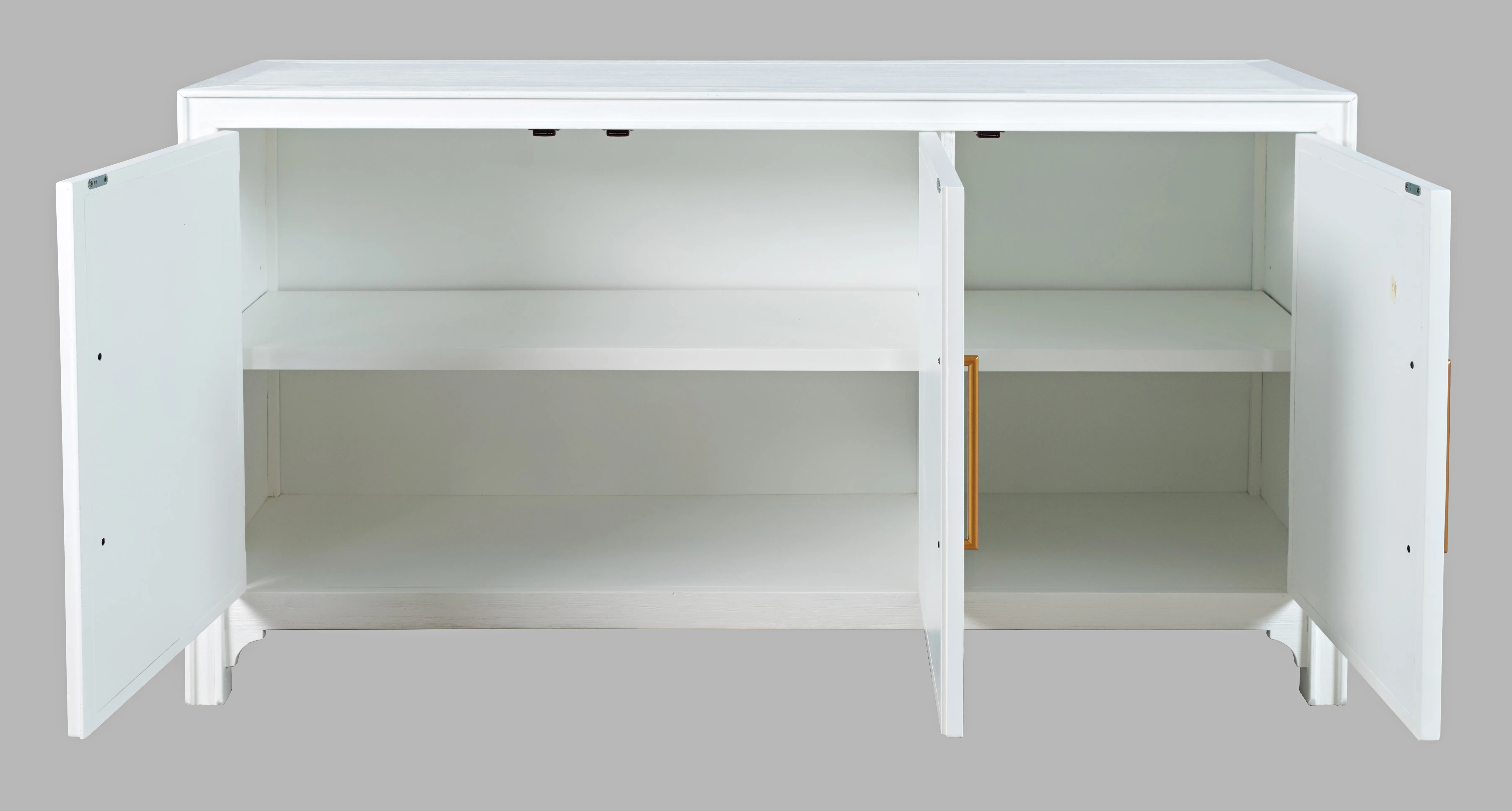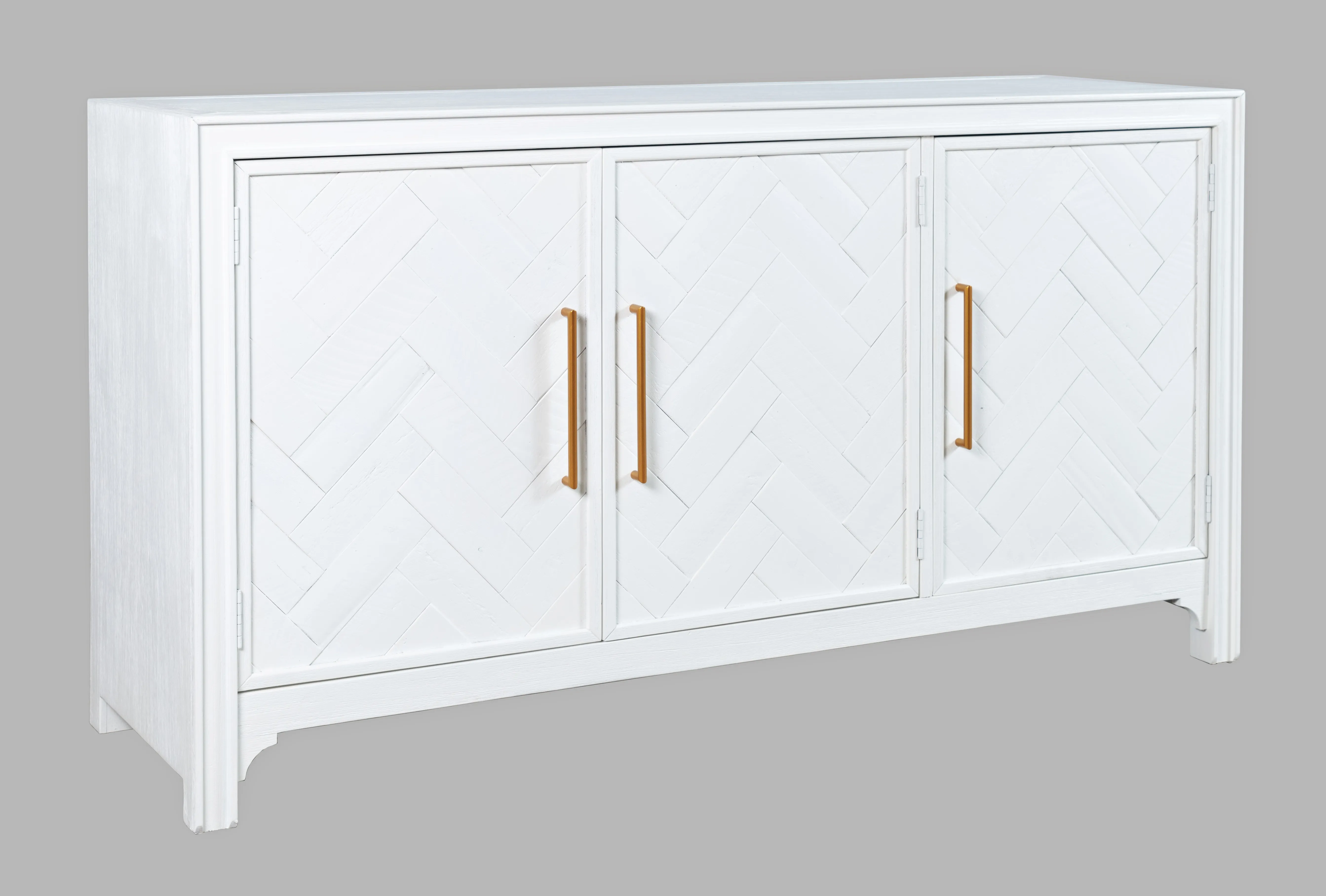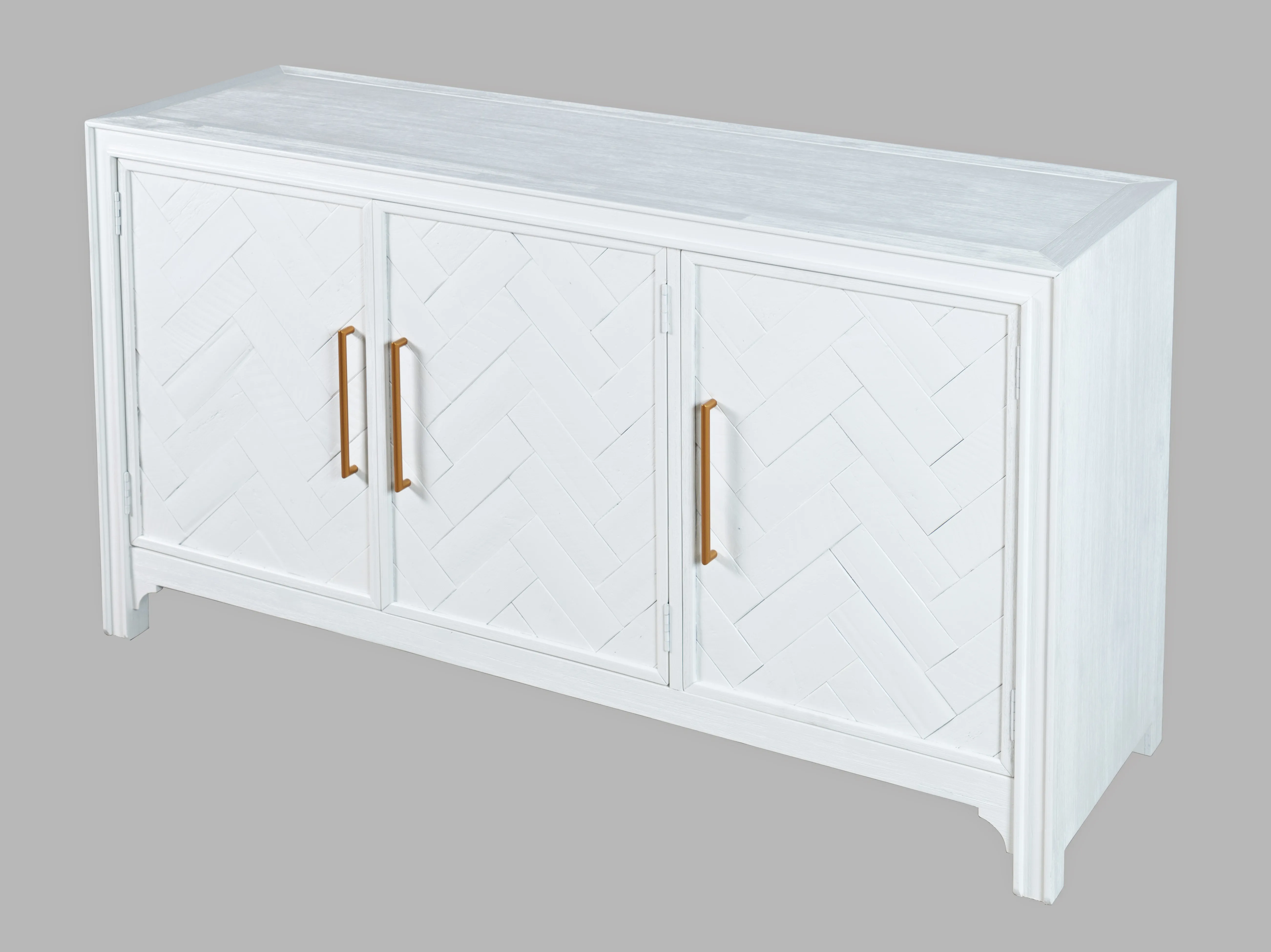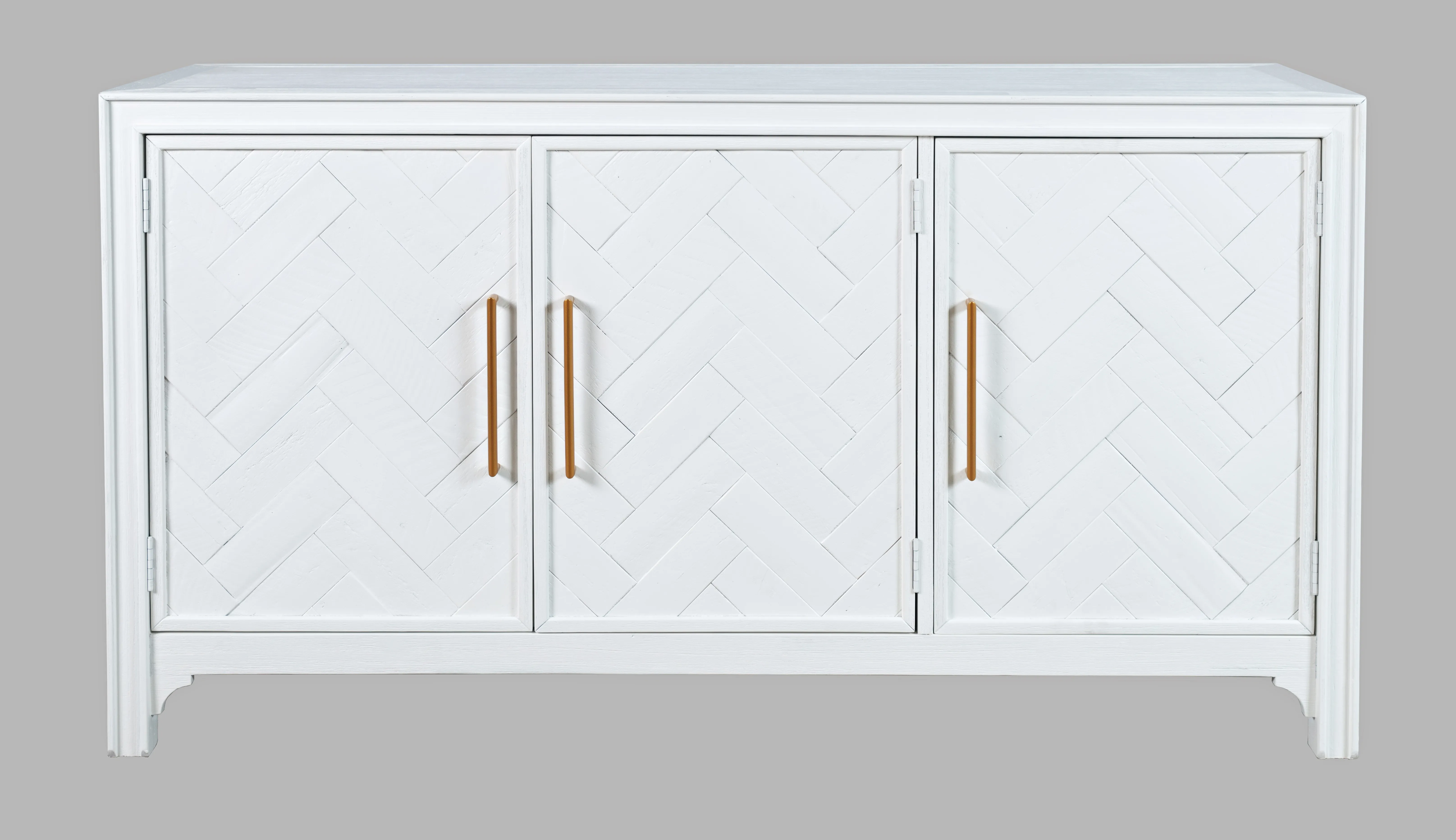 Skillfully crafted with exceptional Mid-Century Modern details, the Gramercy Three-Door Accent Storage Cabinet is the perfect addition to any living space. This beautiful piece of modern furniture is sure to captivate your attention with the sleek lines of a chevron pattern with stunning wire-brush distressing. The inner shelves are adjustable for plenty of flexible storage, and assembly is easy and fast using the available video tutorial. The vintage look makes this a centerpiece bar cabinet, or use it in your living room or dining room for additional space anywhere you need it.
