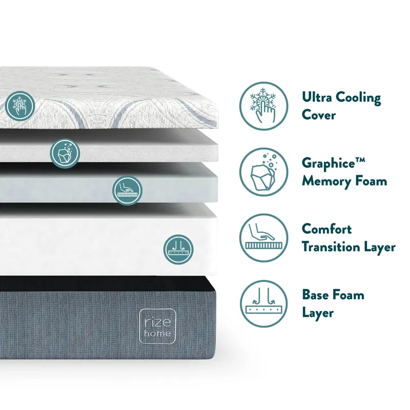 Sleep like never before with our RZ Cool Plus mattress. Featuring a cutting-edge cooling cover and Graphice™ Memory Foam for temperature regulation and optimal spinal alignment. Crafted fiberglass-free, it contours to your body, relieving pressure points with customized support. Hypoallergenic and with a split head option for personalized comfort, it ensures superior motion isolation, while open-cell memory foam enhances breathability and luxury for your best sleep yet.